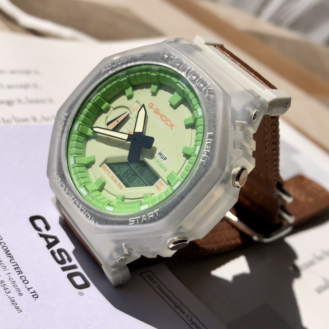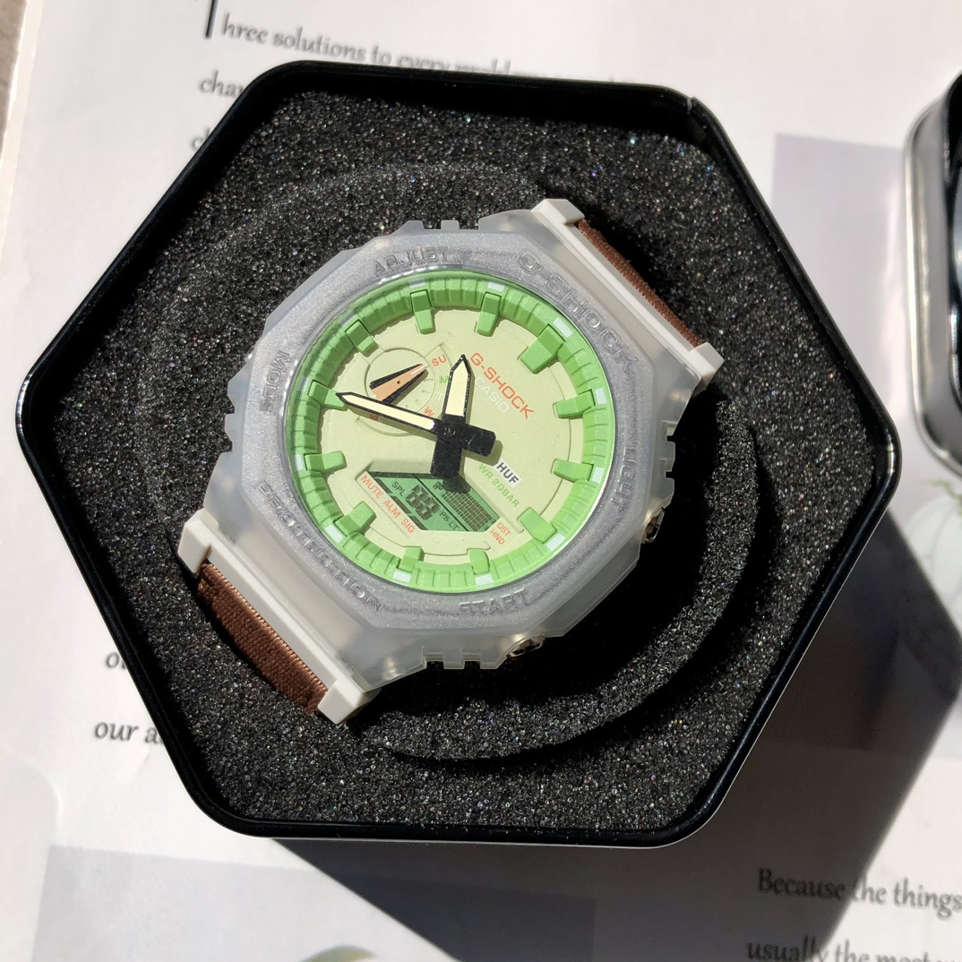 批💰配盒卡西欧G-SHOCK联名HUF 周年限定款手表男女夜光绿腕表 作为街头滑板文化起家的HUF,为庆祝他们的周年,联手Casi•推出了这一款GA “Cas iDak”。 Cas io经典的 “八边形战士” 款式。此款在外形上颠覆了之前的设计,外壳采用白色半透明的材质,表盘上采用HUF标志性的霓虹绿作为装饰,同时印有Casio和HUF两家的Logo,在底盖上则是刻有代 表着HUF周年的宇样。值得一提的是表带采用棕色织物材料,此款本身支持m防水、双LED灯以 及G-SHOCK的碳芯防震保护等功能。这款腕表装在一个定制的盒子中,内村饰有日金山城市街区的地图。